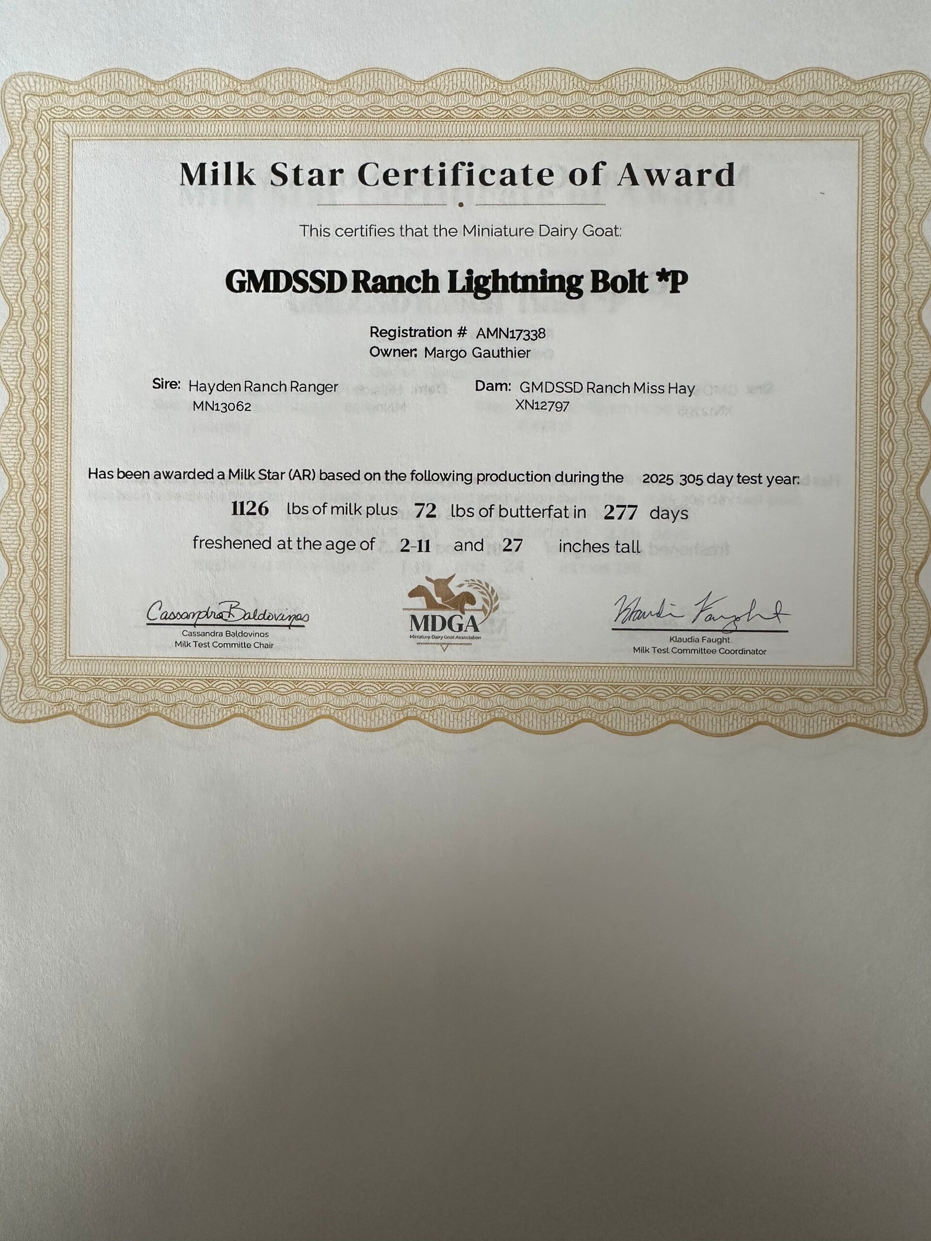 Lightning Bolt isn't just a pretty face; she's a proven producer. At GMDSSD Ranch SafeHaven, known for does achieving top ten in 305-day milk testing in 2024, Lightning Bolt is a shining example. Like all our does, she has earned her prestigious milk stars for 2025, a testament to her exceptional dairy capabilities. This achievement reflects our commitment to maintaining a clean, tested herd, ensuring top genetics for milk production and overall health, with regular testing for CL, CAE, Johnes, and Qfever.